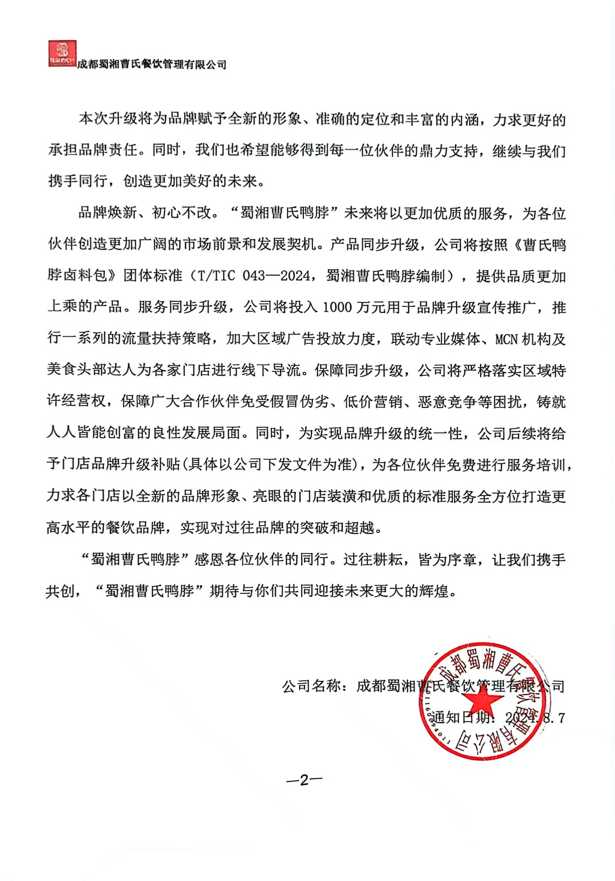 致曹氏鴨脖合作伙伴的一封信